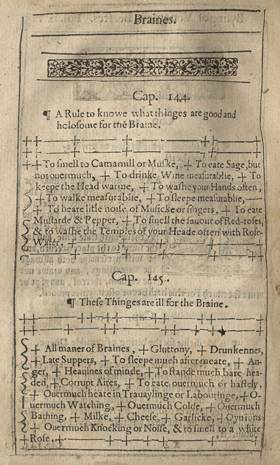 +To Smell to Camamill, +To eate Sage, but not overmuch, +To drinke Wine measurablie, +To keepe the Head warme, +To washe your Hands often, +To walke measurablie, +To sleepe measurablie, +To heare little noise of Musicke or singers, +To eate Mustarde & Peper, +To smell the savour of Red-roses, & to washe the Temples of your Heade often with Rose-Water.